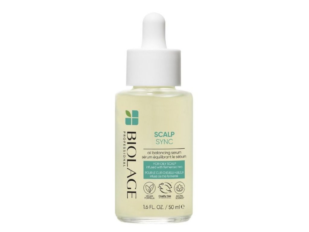 Sérum Scalp Sync pro regulaci mastnoty. Bezoplachové sérum obohacené o fermentovaný čaj, které se používá po umytí k absorpci a redukci přebytečného mazu pro svěží vzhled vlasové pokožky.