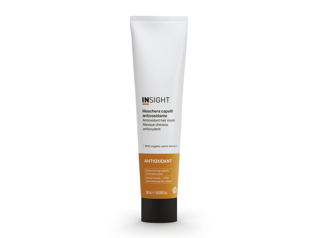 Antioxidační maska na vlasy Insight obsahuje rozjasňující, antioxidační a regenerační fytokomplex složený z organického extraktu z mrkve, sójového másla a oleje z lískových oříšků.