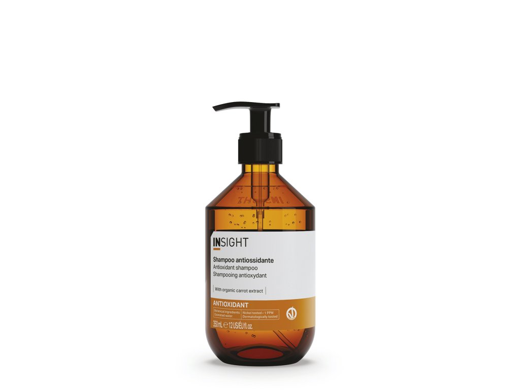 Šampon Insight Antioxidant obsahuje rozjasňující, antioxidační a regenerační fytokomplex složený z organického extraktu z mrkve, sójového másla a oleje z lískových oříšků.
